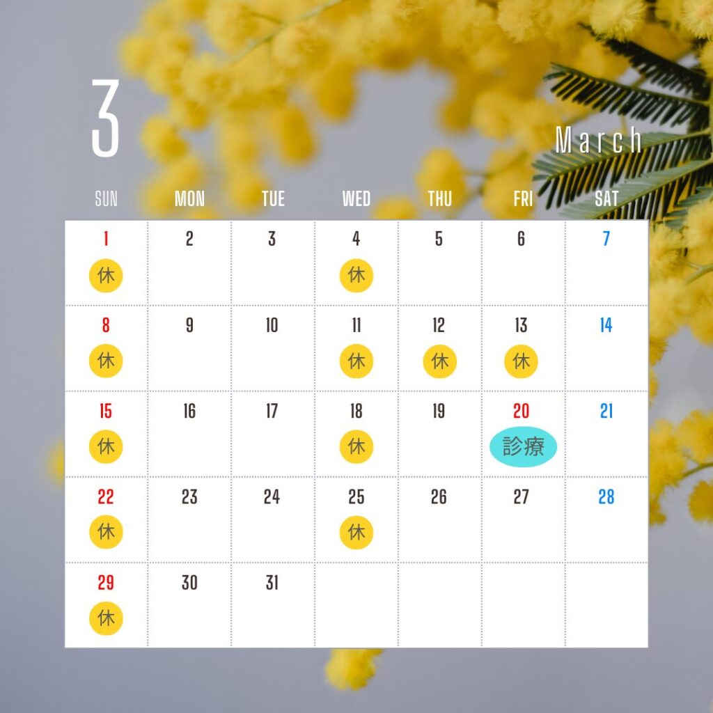 3月診療日のお知らせ 2026 2/27 2026年2月27日 3月の診療日のお知らせ 3月12日(木曜日) 3月13日(金曜日) 上記2日間は、臨時休業とさせていただきます。 3月20日(金曜日)は、祝日ですが、通常時間にて診療します。 ご不便をおかけしますが、よろしくお願いいたします。 お知らせ